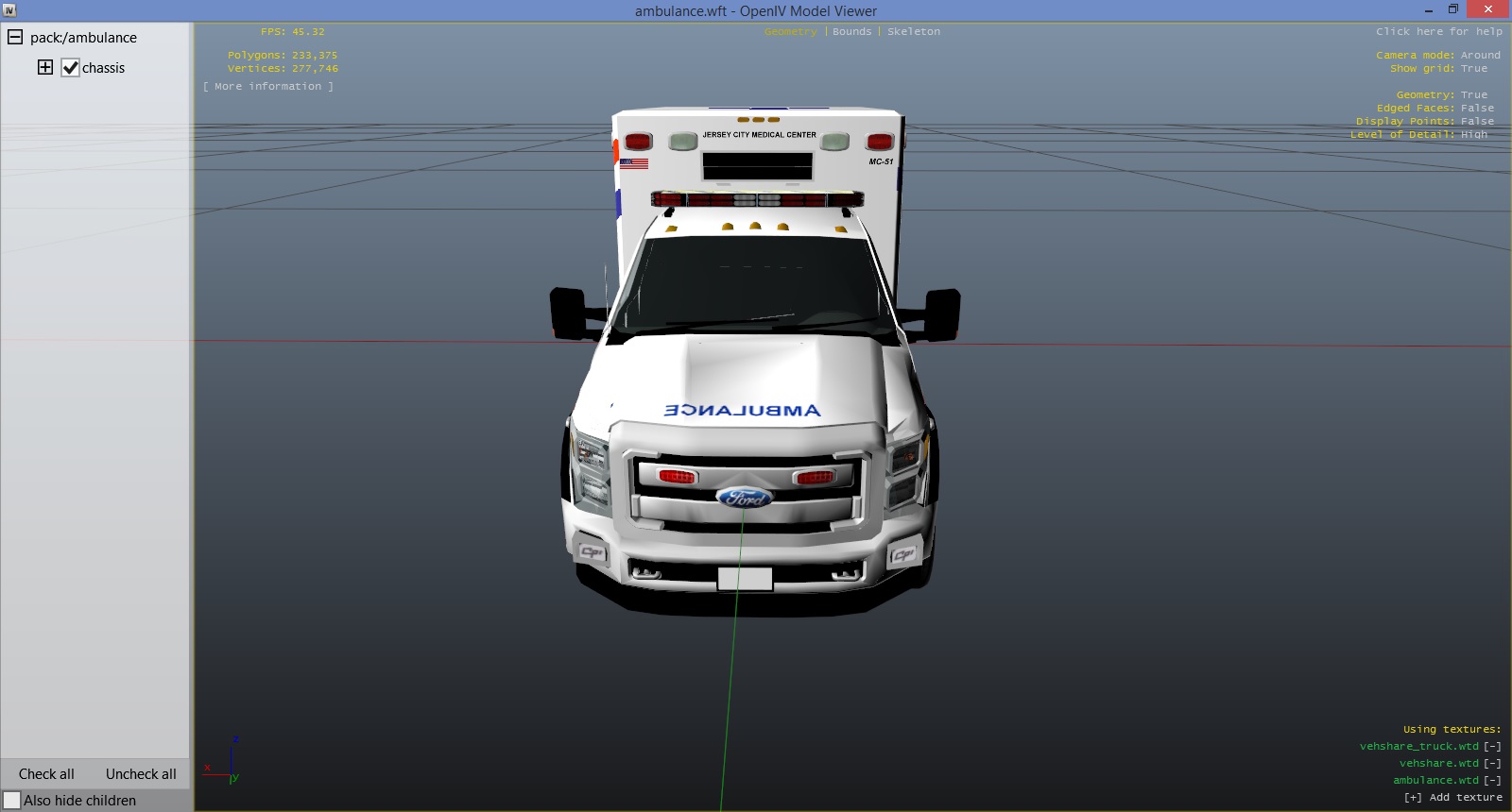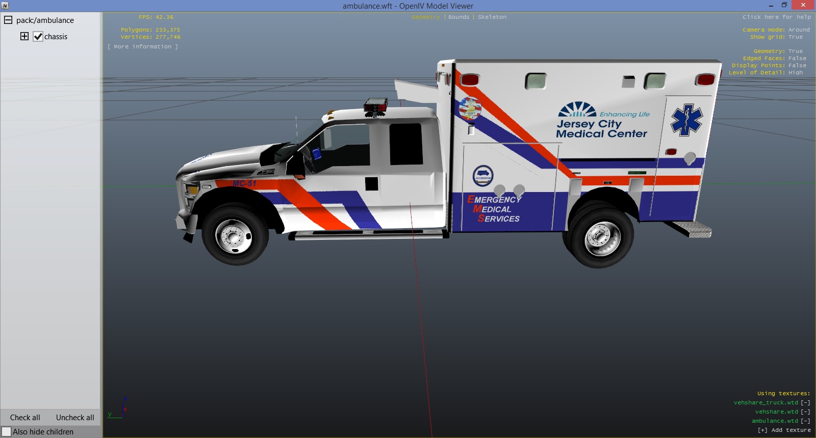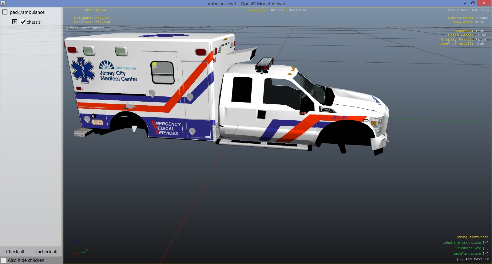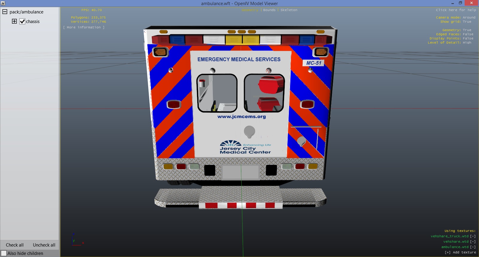 Re-release of my earlier JC Medical Center EMS texture. Completely re-done. Added a few decals and fixed the chevrons.