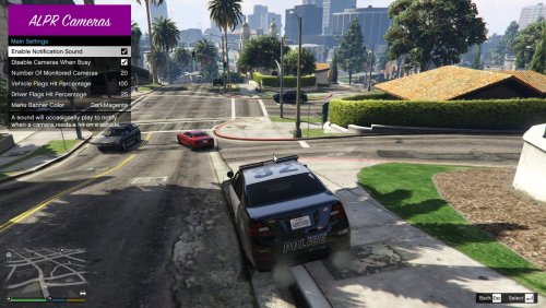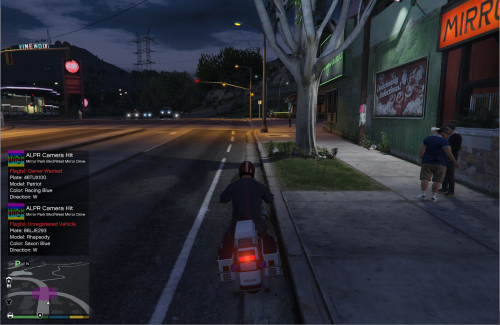 This mod creates ALPR-enabled traffic cameras around the city of Los Santos. If the traffic camera has a hit, it will notify you just as ALPR+ does. The notification will indicate the cross streets, the direction the vehicle is traveling, the flags, the vehicle model, color, and plates. You will only get hits from nearby traffic cameras. View the INI to edit the range.