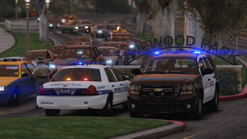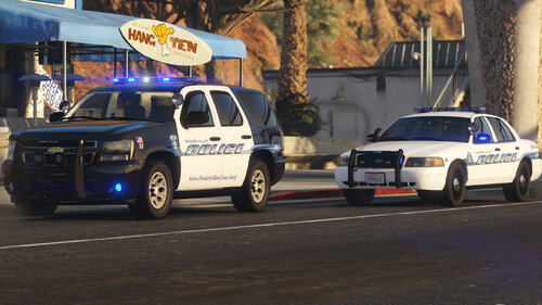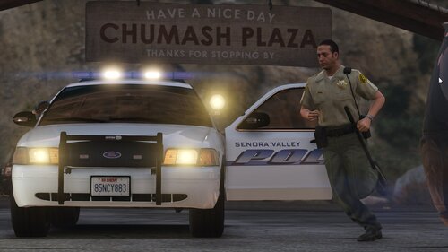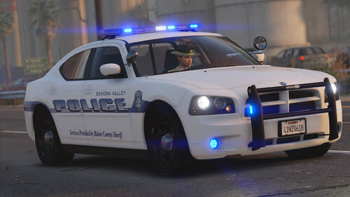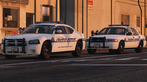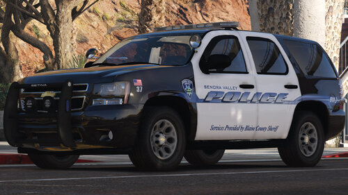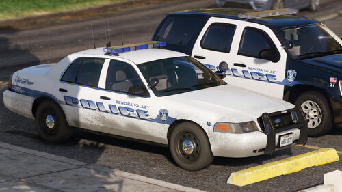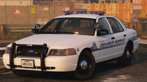 The Senora Valley Police Department is a law enforcement agency staffed and managed by the Blaine County Sheriff's Office, and is responsible for all law enforcement responsibilities in the greater Senora region. This includes, but is not limited to, Harmony, Grapeseed, Sandy Shores, Zancudo and Mount Vinewood region (near the Vineyards). While this department is fictional, the vehicles are designed to adhere to Massachusetts State Law, and the skins (designed by Getinmybelly) are based off of Dupont Police. This department is designed to appear like many less wealthy departments across the United States, wherein older vehicles are used for longer periods of time with recycled parts. As such, the lighting on these vehicles is dated with colored lenses and fewer surface-mounted lights across the vehicles.