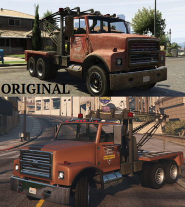 This is my version of the original towtruck in GTAV that removes all the rust, Add chrome bumber and fuel tank, new logo (Jamie Davis towing from Canada) and some other small changes.