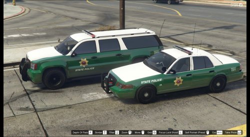 Vehicle Type: PoliceSo...this is my first attempted at skinning in gta so it's not perfect, anyways. San Andreas State Police skin for the CVPI and Granger. Its not based off of anything, i just like the green on white.