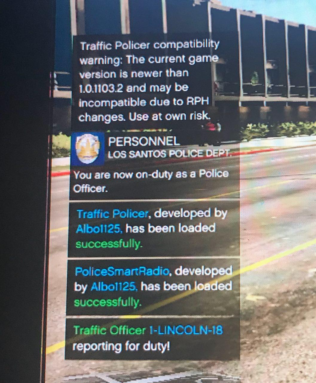hello, first forgive me for my English, is the translator: S, the mod lspdfr is good, I choose uniform, car I get on top of the map the loading messages all perfect but as you can see in the picture it tells me that my game is more new than version 1.0.1103.2 and is incompatible with the changes of rph, I get a mission, I do it and shortly after or crash the game (black screen) or I stop working the radio, the menu "n" " b "or the traffic manager, what is the problem? Is it possible that the error of the version passes this? And if so, where can I download the new version? thank you very much!!