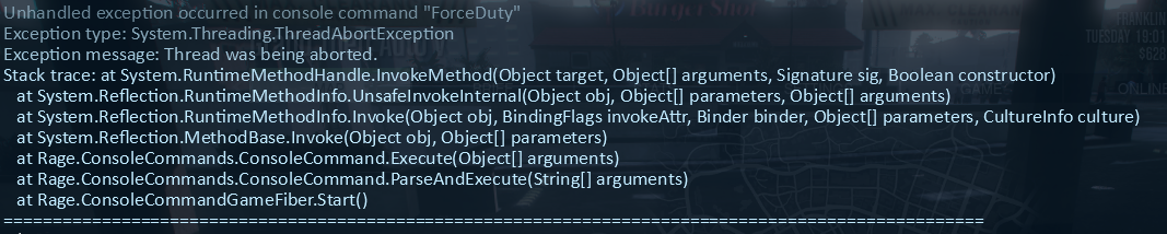 [11/4/2018 9:54:43 PM.439] Unhandled exception occurred in console command "ForceDuty"