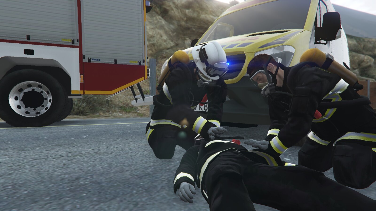 Polish firefighters tending to an injured fireman