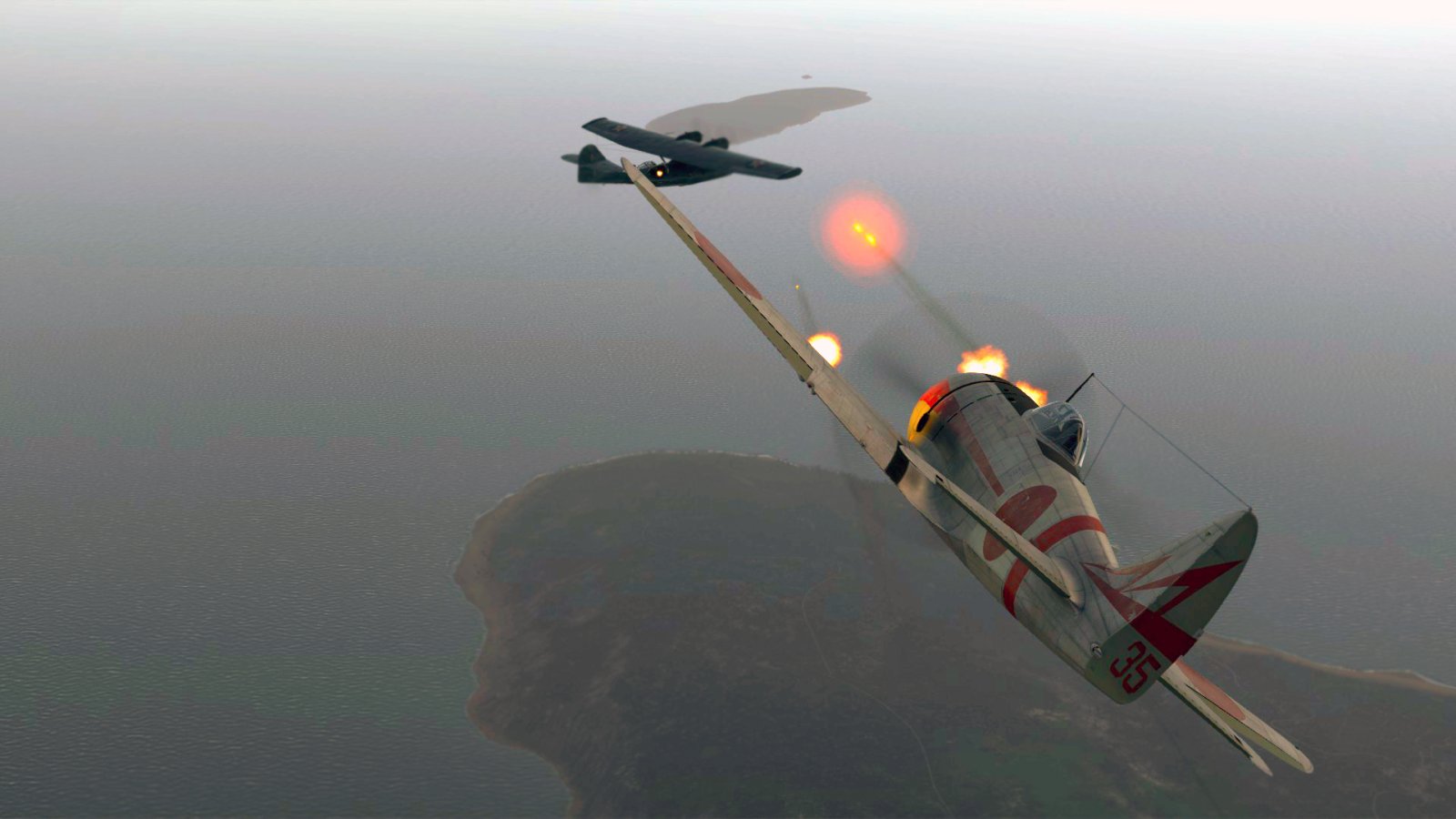 A Catalina is engaged and promptly destroyed by a Ki-44-II Otsu, a dedicated bomber hunter.
