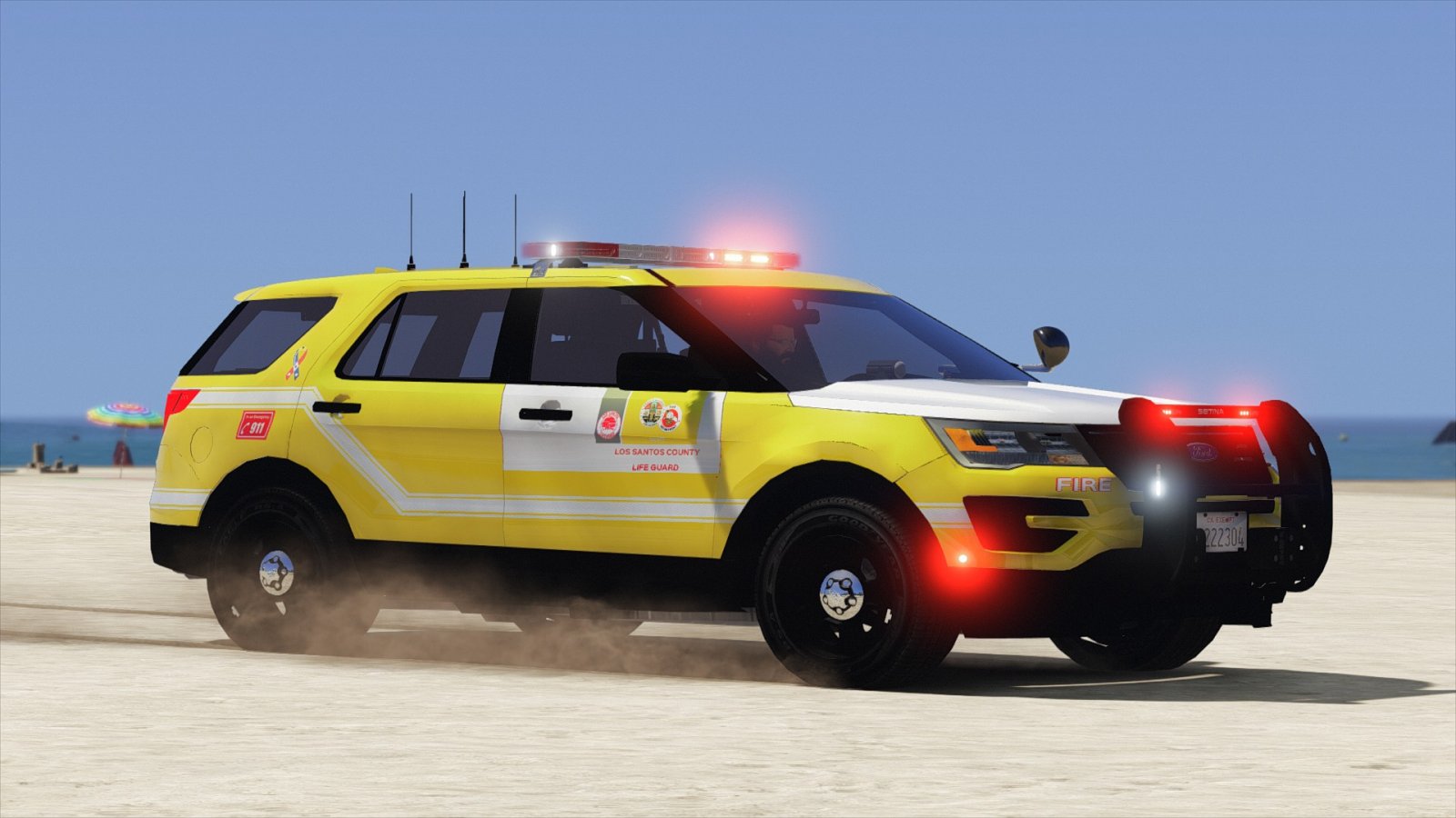 No red/blue lights on this unit, It's all red with red/white splits IONs on the sides of the pushbar.
