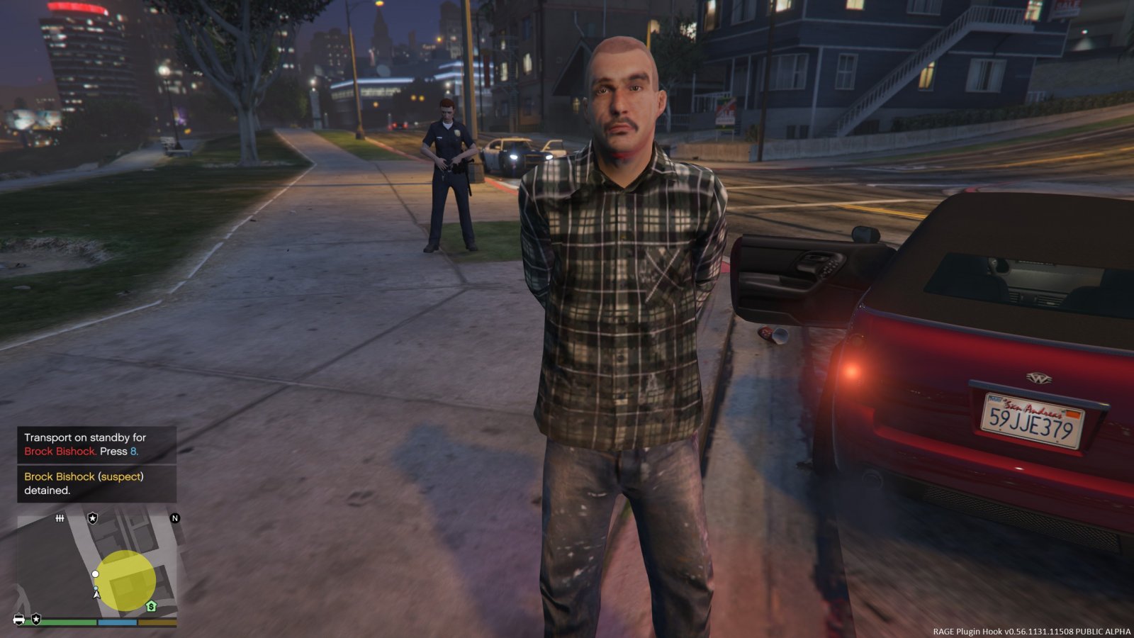 Responded to a silent alarm call in East Vinewood, and look who I found as the getaway driver! Cal Chuchesta, himself. When I detained him, he gave me the name of "Brock Bishock", which is obviously a fake name. His friend was arrested for resisting arrest, burglary, and possession of stolen cash. Chuchesta was arrested for aiding and abetting, along with the possession of burglary tools found in an Issi's trunk.