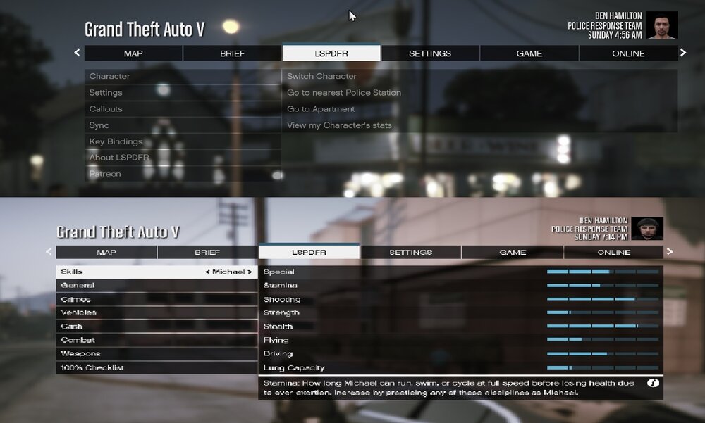 Hi all, The LSPDFR menu tab keeps changing back to the vanilla game stats page even though LSPDFR is running. This happens no matter which agency I'm playing as, sometimes after a callout other times it changes while I'm patrolling. It also happens after I've reloaded all plugins from the rage console. I've tried changing the texture directory in the agency.xml but that's had no effect. Any advice would be appreciated. Thanks