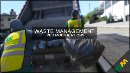 Waste Management - Ped Modifications It is forbidden to modified this version for public without permission. Please Do not re-upload with out my consent Private Message, too work out the texture usage. (All Official logos used are full rights to waste management 2015.) Installation (Detailed Installation Included In Read Me (Credits & Info) (I did not Included any other mods used In the screen shots, the garbage truck textures have not been released.) Step 1: Locate your game (heueueheuhe <3) Step 2: If using Open IV ASI loader: GTA V -> mods -> x64e.rpf -> models -> cdimages -> compentpeds_s_m_y.rpf If using normal files: GTA V -> x64e.rpf -> models -> cdimages -> compentpeds_s_m_y.rpf ( Make sure to make backups people, I am not going to be giving out back-ups, If you're modding you should know better then Install stuff with out back ups. ) This modification goes great with the following mods! If you have any questions or comments feel free to leave them below or contact me via Private message. Please do not use the rate system as a comment section, If you have Issues please leave them In the comment section of this upload.) Happy gaming!