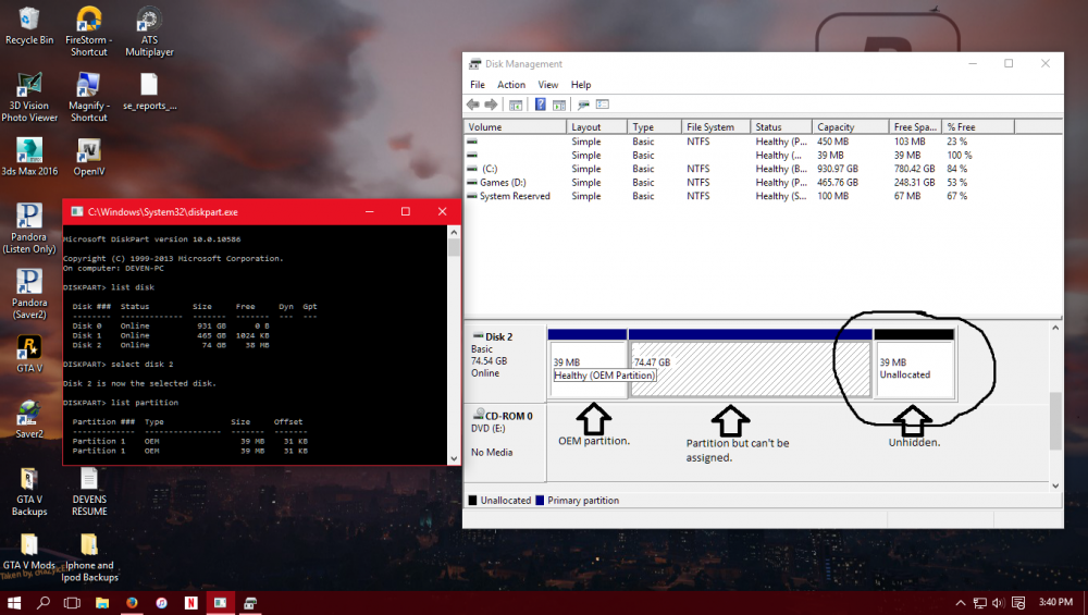 Okay, so i have a hard drive that was hidden, but I fixed that problem. As you can see in the photo i have a partition that is unassigned but assigned at the same time? I can't give it a volume letter and when i search it in the diskpart program the partition isn't listed under the disk volume. Any ideas? Need Help A.S.A.P.
