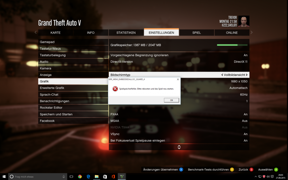 show the game error.... Menory card error ? EDIT:// [ERR_MEM_EMBEDDEDALLOC_GUARD_4] {Game memory error. Please reboot and restart the game.}- GTA V crash