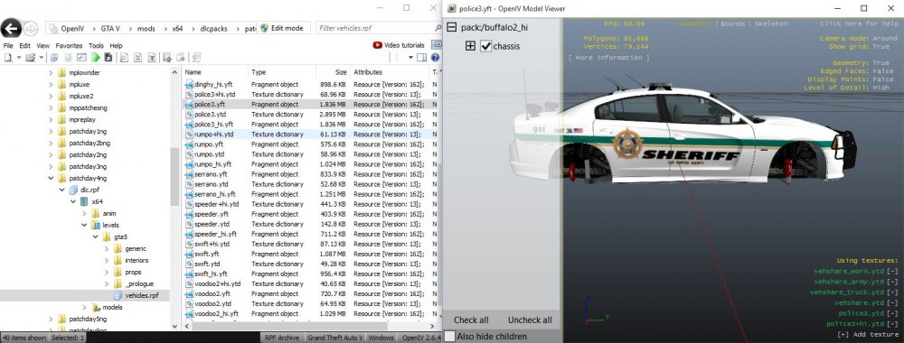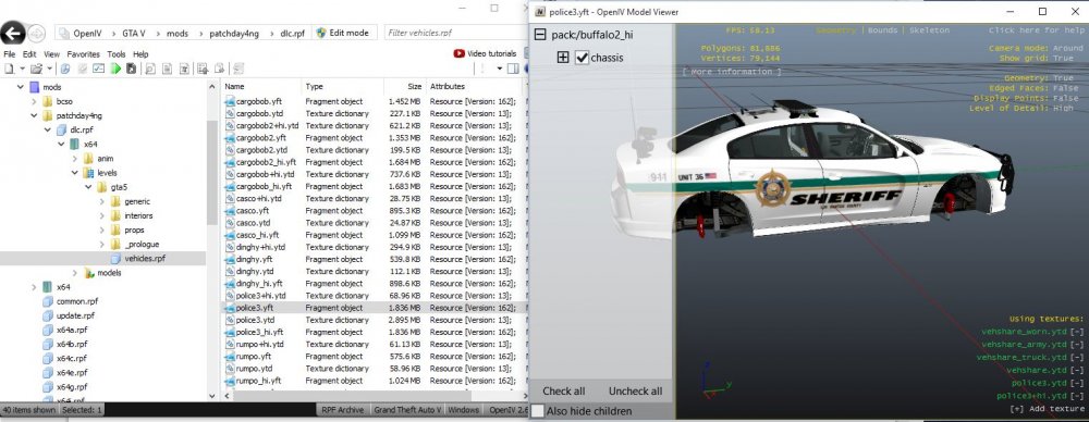 Sorry I forgot to mention that I also replaced Police3 in patchday4ng as well but it's not working. Can you explain a little by checked my police3+hi.ytd? Because I have 2 patchday4ng folders in my MODS folder for some reason... I've attached screenshots showing the files were replaced correctly and show up in the model viewer but in game it's still the same stock vehicle. Thanks for the help