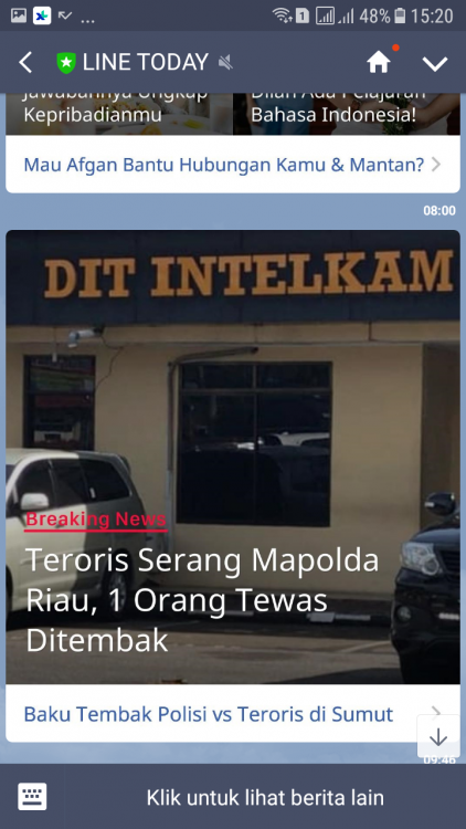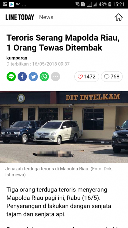 Terrorism never ends. It's just getting better and better. After the last police station assault, this morning a police station HQ was assaulted in Riau. https://www.sbs.com.au/news/militants-killed-after-attacking-indonesia-police-with-samurai-swords From what I heard, the last bombing conducting 3 families few days ago might related to the ongoing middle east wars between IS and several countries. https://www.channelnewsasia.com/news/asia/officer-3-attackers-dead-pekanbaru-indonesia-police-station-10238316 This is something that you never see everyday. Suspect gets up close with samurai swords then shot to death in gunfire. I saw this news after I switched the TV channels for a while and also on LINE TODAY's broadcast few hours after I watched it. I dunno that shit's getting real now. It'll never end well, I suppose. Last time I switched the channels was at 11 o'clock.