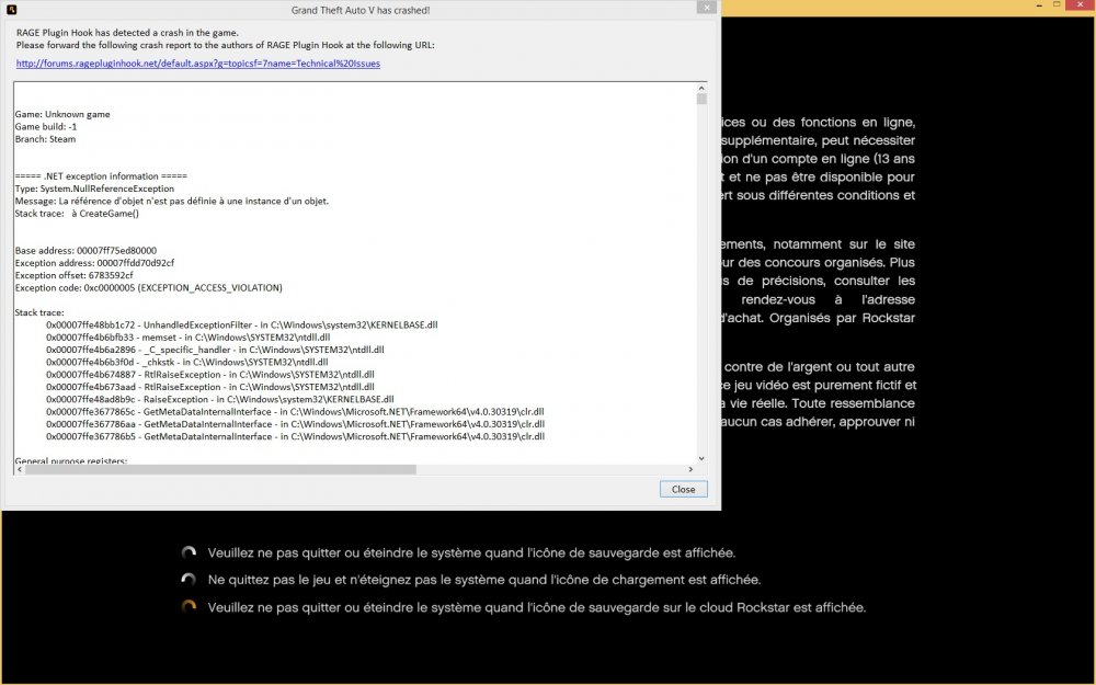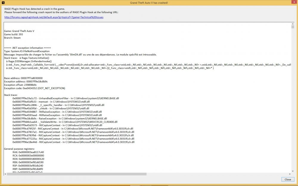 Encore le même problème au lancement du RAGEPluginHook.exe en version lspdfr 0.2. il crash avec 3 ou 4 bip sonore.