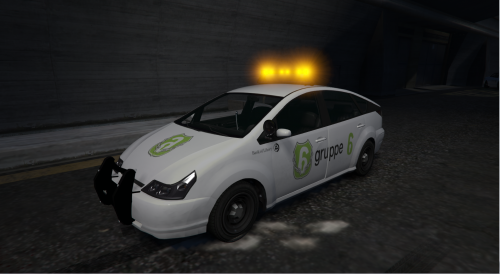 The mod gives the car a new lore friendly Gruppe 6 paintjob, amber lights/siren, a spot light and radio/computer.