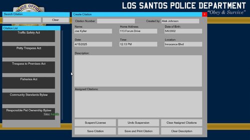 Hello, Currently this includes Traffic Safety Act (any traffic ticket you can think of) Trespass to Premise Act Petty Trespass Act Fisheries Act Environmental Protections and Enhancement Act Community Standards Bylaw Responsible Pet Ownership Bylaw (Animal control bylaw) This mod is meant to be an extension to this mod found here: -