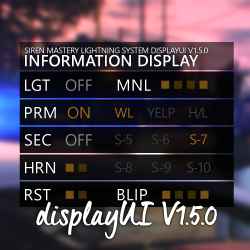 "displayUI" is an user interface made for @Albo1125's SirenMastery plugin. It's look has been mainly inspired by the UI used in @Lt.Caine's Emergency Lightning System IV V8.51 for LCPDFR. It's goal is to display all the important information to the player, while remaining simple and classy, perfectly fitting the rest of the GTA V's interface.