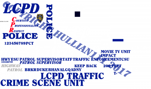 Still nothing much to say here. Well...here is an LCPD livery pack containing all the divisions of the LCPD featured in Abraxas' Vanilla Vehicles Texture Pack: Included are two versions of the pack - big numbers in blue (this goes on normal white paintjobs), and big numbers in white (this goes on old Auxiliary/Traffic Enforcement/Truck Enforcement dark blue paintjobs). Also included are the two rather unknown fonts used for the LCPD text - Clearface Black and Clearface Black Italic - courtesy of the site ufonts. This avoids a rather unsafe site visit, and also allows you to make your own LCPD-related text. Some of it may be incorrect - Clearface Black does not suit the word 'POLICE' apparently for the white text - but I did my job well, I believe. However, this has not been tested, so use at your own risk. And when editing, GIMP is HIGHLY RECOMMENDED. If a image editing program is not used, then all white text will be rendered unusable due to the alpha channel disappearing. While Photoshop may have this figured out, I'm not sure if it recognises GIMP alphas, so GIMP really should be used. License plates? Maybe. Haven't figured them out yet, but in all, enjoy, and credit me! -