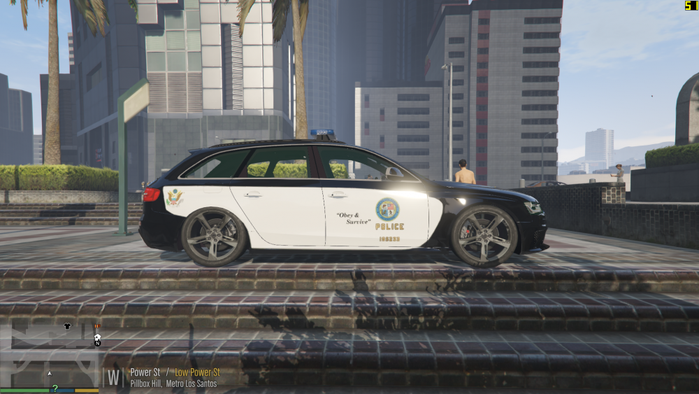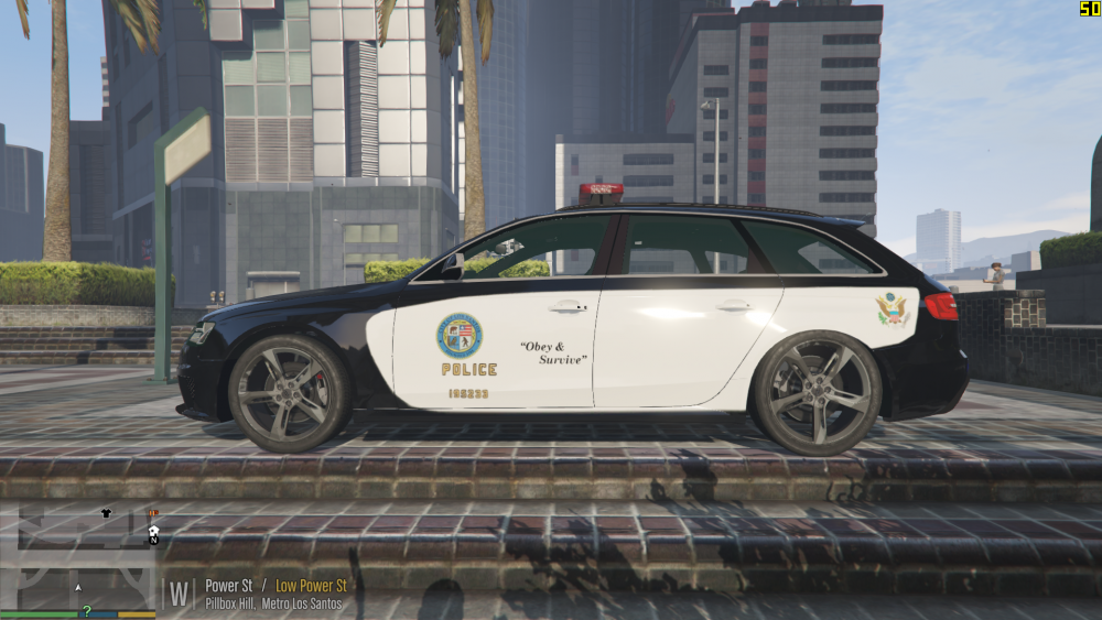 Finally I've got a proper lightbar on this model! ..and rear interior LEDs (Now you can replace it with police2 or police3) MAJOR credit to @Thero & @ALLENjr12, this model would still be at 0.9.3 if it weren't for them! Different Version of the LSPD Livery: Check out the Alternate #2 Skin Pack by @Krame86 Replaces: Police2 or Police3 To replace a different police car rename the yft + ytd files to the desired car (eg: for sheriff2 "police2+hi.ytd"->"sheriff2+hi.ytd") Installation: Open OpenIV and go to: GTA V\(mods)\update\x64\dlcpacks\patchday3ng\dlc.rpf\x64\levels\gta5\vehicles.rpf Make sure you are on "Edit Mode" Drag all the contents from the "Files" into OpenIV Spawn: 2rd Car when going on Duty (LSPDFR) Spawn: "Police2" with any trainer You will see this Audi being driven by IA cops around los santos, spawn parked in certain police stations and will provide backup for when requesting "Local Patrol Unit" backup in Los Santos. NOOSE Decals by @CriticalBrit Check out the entire NOOSE Livery Pack below If you record any videos with this model PM me the link and I might feature it here "Under NO CIRCUMSTANCES should you ask for support in the review section." If you do the admins will remove your review and your account will be subject to sanctions. If you need help or support, use the comment section instead.- 53 comments