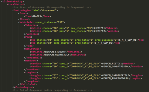This is a simple edit of the defaultregions.xml and customregions.xml that allows the following departments to respond in conjunction with the parent agency (EG LSPD, BCSO, etc) when calling for localpatrol backup. - Sheriff responding in the city - Metro police responding in the city - Sandy Shores Police responding in Sandy Shores - Paleto Bay Police responding in Paleto Bay - Grapeseed Police responding in Grapeseed Once the download archive opens, you will be greeted by three folders that contain defaultregions.xml. Pick the one you'd like and install. Then drag and drop the CustomRegions.xml and your chosen defaultregions.xml into the location described below. **Important:** You will need to edit! Specifically, vehicle names and the peds. You can add more vehicle lines as needed, just make a new line and change the name. I have added comments in the XMLs that help you know where to begin editing and when to stop. If you need further help, please post in the comments. You must have Ultimate Backup!! - https://bejoijo256.wixsite.com/bejoijo/post/ultimate-backup To install the XML - Open your GTA directory / Plugins / LSPDFR / Ultimate Backup. Drag and drop. A few things to note: - I recommend you backup your original XMLs just in case. - I may include a SpecialUnits if the need arises. - The result ends up looking a lot better if you use add-on cars to fill in for Metro, Sandy Shores PD, etc. Here's my guide for installing add-ons - - As of right now, I am not including State Trooper/Highway Patrol due to the fact that they are basically the same thing as far as Ultimate Backup is concerned. However, I can include a version separating them into two departments (this way you can use different peds) if requested. - I recommend messing around with the customization just to learn. 🙂 Huge thanks to @TreadRed for pointing out a huge flaw in my plan for this file and helping to correct it. In case you need suggestions for certain vehicles to fill the slots, here's some that I use: Metro, County and State Patrol - Highway patrol - Sandy Shores police - Paleto Bay Police - -