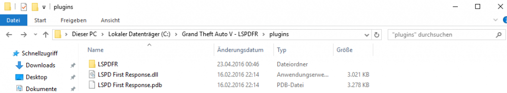In deinem gezeigten Ordner müssen folgende Dateien enthalten sein: LSPDFR LSPD First Response.dll LSPD First Response.pdb Alle restlichen Dateien müssen in den darin enthaltenden Ordner namens LSPDFR verschoben werden. Mein Ordnerinhalt von ...\plugins Mein Ordnerinhalt von ...\plugins\LSPDFR