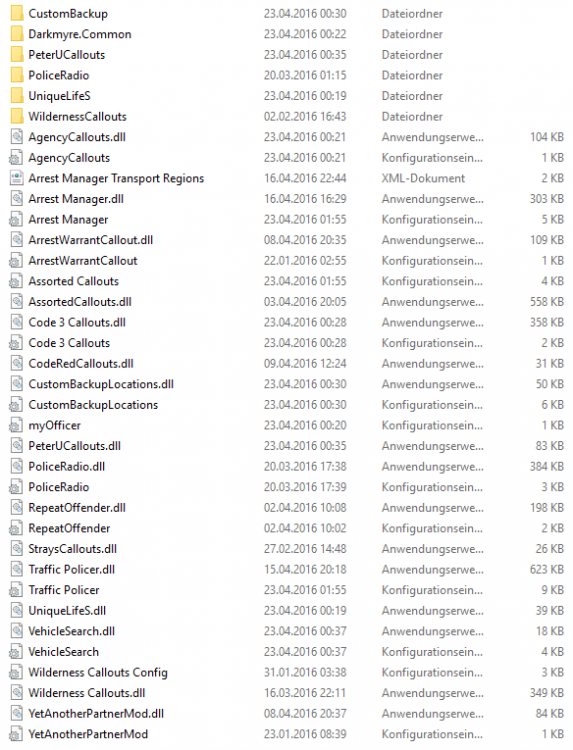 Hallo @mawli, bist du dir denn auch sicher, dass du alle Add-Ons bzw. Callouts in das Verzeichnis ...\plugins\LSPDFR\ installiert hast? Bei einer erfolgreichen Installation sollte das Verzeichnis wie auf dem folgenden Bild aussehen: Außerdem kannst du mittels der RAGE Plugin Hook-Konsole (F4) ingame feststellen, ob deine Callouts überhaupt geladen werden. Liebe Grüße, Kyrilenko
