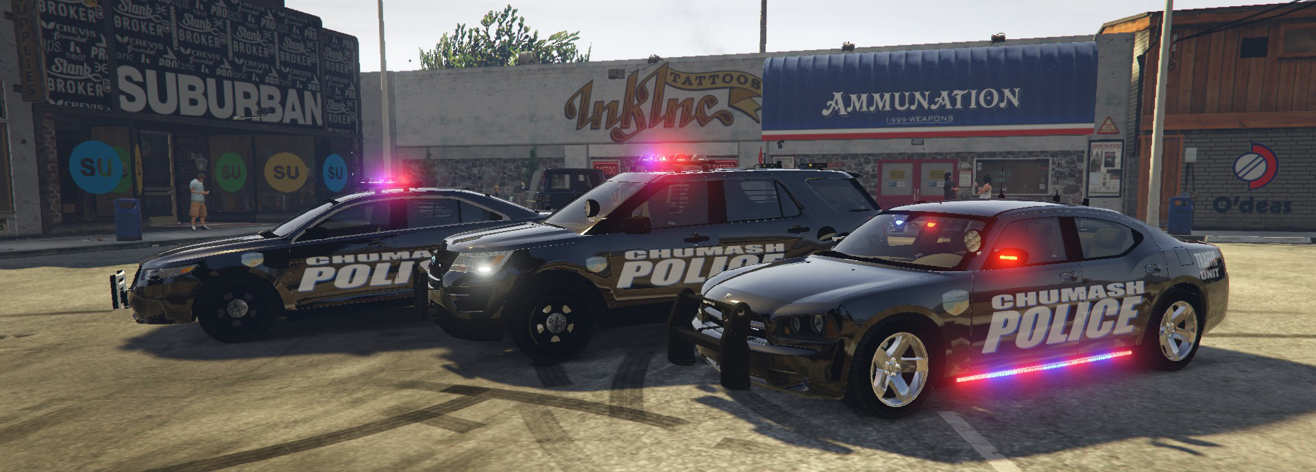 Have not seen any textures or cars for the tiny ocean-side village of Chumash in GTA V, so Happy New Year, here is my "Work in Progress" skins for the city of Chumash. I did the Charger first, then the Explorer and then the Interceptor (Which I admit the text needs angled and will be updated, I think the other two cars are set to go! Suggestions? These are my first skins.) They are for the 2016 NYPD Explorer and 2013 NYPD Police Interceptor, both made by OfficerWalters and a 2009 Dodge Charger Unmarked made by PSource.