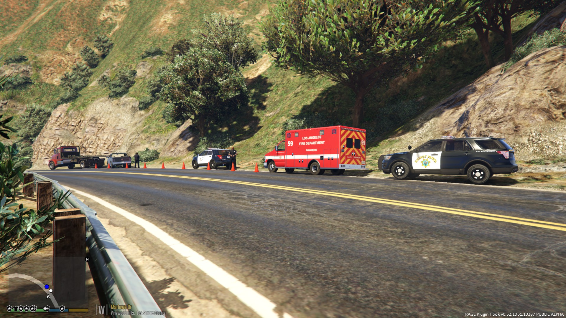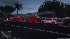 A rescue truck, a LAFD paramedic unit, and a park ranger Tahoe. -