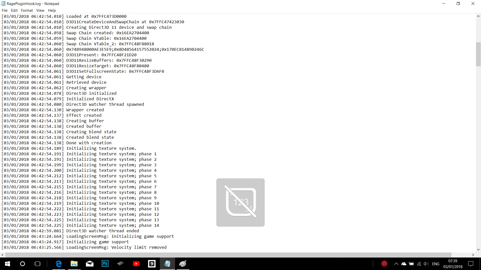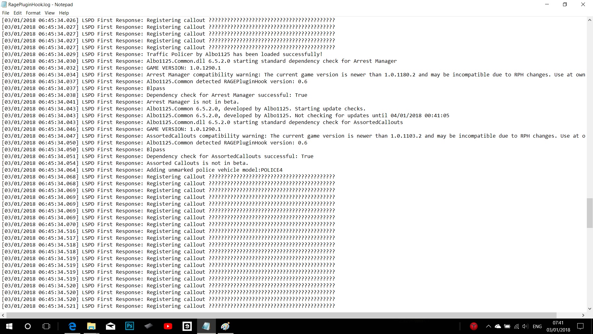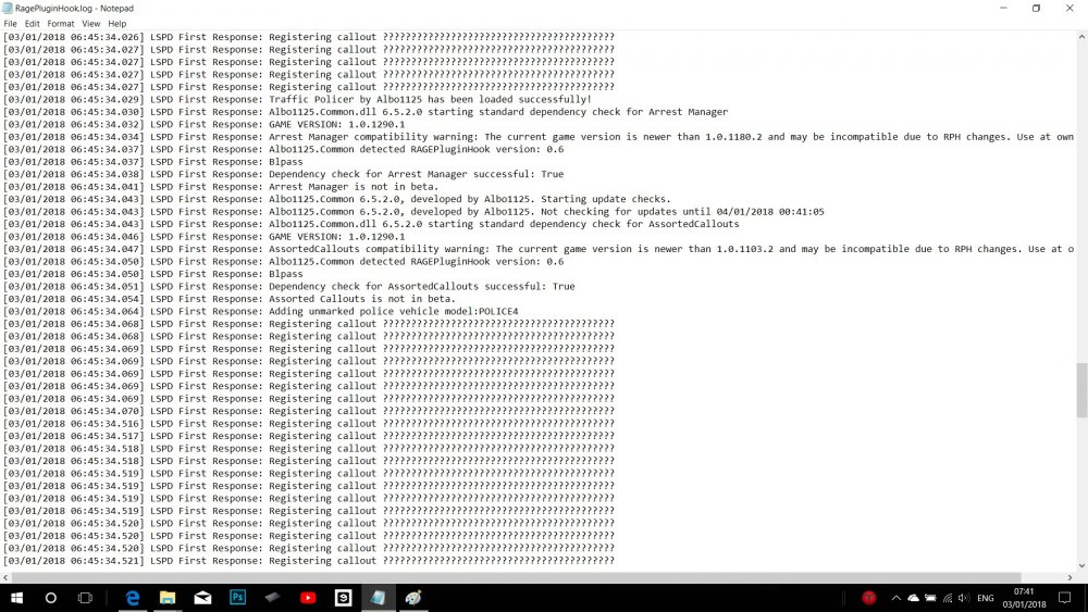 [03/01/2018 08:19:22.734] Started new log on 03/01/2018 08:19:22.734 [03/01/2018 08:19:22.737] ==================================================================================================== [03/01/2018 08:19:22.728] Log path: C:\Program Files (x86)\Steam\steamapps\common\Grand Theft Auto V\RagePluginHook.log [03/01/2018 08:19:22.738] Log verbosity: Trivial [03/01/2018 08:19:22.740] Initializing input system [03/01/2018 08:19:22.743] Initializing game console [03/01/2018 08:19:22.751] Console key has been set to F4 (key code: 115) [03/01/2018 08:19:22.848] Initializing console variable "ConsoleScrollAmount". [03/01/2018 08:19:22.849] Type: System.Int32, Reading section: "Miscellaneous", key: ConsoleScrollAmount [03/01/2018 08:19:22.852] Read value: <null> [03/01/2018 08:19:22.852] Initializing console variable "DisableRenderVersionText". [03/01/2018 08:19:22.852] Type: System.Boolean, Reading section: "Miscellaneous", key: DisableRenderVersionText [03/01/2018 08:19:22.859] Read value: True [03/01/2018 08:19:22.859] Setting value of console variable "DisableRenderVersionText" to stored value. [03/01/2018 08:19:22.859] Initializing console variable "ConsoleKey". [03/01/2018 08:19:22.859] Type: System.Windows.Forms.Keys, Reading section: "Miscellaneous", key: ConsoleKey [03/01/2018 08:19:22.860] Read value: <null> [03/01/2018 08:19:22.860] Initializing console variable "PluginTimeoutThreshold". [03/01/2018 08:19:22.860] Type: System.Int32, Reading section: "Miscellaneous", key: PluginTimeoutThreshold [03/01/2018 08:19:22.861] Read value: 10000 [03/01/2018 08:19:22.861] Setting value of console variable "PluginTimeoutThreshold" to stored value. [03/01/2018 08:19:22.862] Initializing console variable "AlwaysShowConsoleOutput". [03/01/2018 08:19:22.862] Type: System.Boolean, Reading section: "Miscellaneous", key: AlwaysShowConsoleOutput [03/01/2018 08:19:22.862] Read value: <null> [03/01/2018 08:19:22.862] Initializing console variable "ShowConsoleCommandInfoOnPluginLoad". [03/01/2018 08:19:22.862] Type: System.Boolean, Reading section: "Miscellaneous", key: ShowConsoleCommandInfoOnPluginLoad [03/01/2018 08:19:22.863] Read value: <null> [03/01/2018 08:19:22.863] Initializing console variable "ShowOnScreenWarnings". [03/01/2018 08:19:22.863] Type: System.Boolean, Reading section: "Miscellaneous", key: ShowOnScreenWarnings [03/01/2018 08:19:22.864] Read value: <null> [03/01/2018 08:19:22.865] Console initialized [03/01/2018 08:19:22.865] Initializing forms manager [03/01/2018 08:19:22.868] Version: RAGE Plugin Hook v0.60.1201.14419 PUBLIC ALPHA for Grand Theft Auto V [03/01/2018 08:19:22.876] ================ RAGE Plugin Hook ================ [03/01/2018 08:19:22.890] Detected Windows 10 Home (64-bit) (10.0.16299.0)! [03/01/2018 08:19:22.897] Checking game support [03/01/2018 08:19:23.173] Product name: Grand Theft Auto V [03/01/2018 08:19:23.175] Product version: 1.0.1290.1 [03/01/2018 08:19:23.176] Is steam version: True [03/01/2018 08:19:23.178] Initializing DirectX [03/01/2018 08:19:23.180] Initializing Direct3D [03/01/2018 08:19:23.181] Loading C:\WINDOWS\system32\d3d11.dll [03/01/2018 08:19:23.182] Loaded at 0x7FFC473D0000 [03/01/2018 08:19:23.182] D3D11CreateDeviceAndSwapChain at 0x7FFC47423030 [03/01/2018 08:19:23.183] Creating Direct3D 11 device and swap chain [03/01/2018 08:19:23.233] Swap Chain created: 0x22185EB15C0 [03/01/2018 08:19:23.236] Swap Chain VTable: 0x22185EB15C0 [03/01/2018 08:19:23.237] Swap Chain VTable_2: 0x7FFC48F88018 [03/01/2018 08:19:23.237] 0x748948000AE3E5E9;0x8D48564157552024;0x170EC814890246C [03/01/2018 08:19:23.238] D3D11Present: 0x7FFC48F21D20 [03/01/2018 08:19:23.238] D3D11ResizeBuffers: 0x7FFC48F30290 [03/01/2018 08:19:23.238] D3D11ResizeTarget: 0x7FFC48F80480 [03/01/2018 08:19:23.239] D3D11SetFullscreenState: 0x7FFC48F3DAF0 [03/01/2018 08:19:23.239] Getting device [03/01/2018 08:19:23.240] Retrieved device [03/01/2018 08:19:23.240] Creating wrapper [03/01/2018 08:19:23.259] Direct3D initialized [03/01/2018 08:19:23.260] Initialized DirectX [03/01/2018 08:19:23.261] Direct3D watcher thread spawned [03/01/2018 08:19:23.311] Wrapper created [03/01/2018 08:19:23.318] Effect created [03/01/2018 08:19:23.318] Creating buffer [03/01/2018 08:19:23.318] Created buffer [03/01/2018 08:19:23.319] Creating blend state [03/01/2018 08:19:23.319] Created blend state [03/01/2018 08:19:23.319] Done with creation [03/01/2018 08:19:23.368] Initializing texture system. [03/01/2018 08:19:23.369] Initializing texture system; phase 1 [03/01/2018 08:19:23.370] Initializing texture system; phase 2 [03/01/2018 08:19:23.376] Initializing texture system; phase 3 [03/01/2018 08:19:23.377] Initializing texture system; phase 4 [03/01/2018 08:19:23.387] Initializing texture system; phase 5 [03/01/2018 08:19:23.389] Initializing texture system; phase 6 [03/01/2018 08:19:23.391] Initializing texture system; phase 7 [03/01/2018 08:19:23.393] Initializing texture system; phase 8 [03/01/2018 08:19:23.394] Initializing texture system; phase 9 [03/01/2018 08:19:23.396] Initializing texture system; phase 10 [03/01/2018 08:19:23.400] Initializing texture system; phase 11 [03/01/2018 08:19:23.400] Initializing texture system; phase 12 [03/01/2018 08:19:23.402] Initializing texture system; phase 13 [03/01/2018 08:19:23.402] Initializing texture system; phase 14 [03/01/2018 08:19:28.262] Direct3D watcher thread ended [03/01/2018 08:19:53.837] LoadingScreenMsg: Initializing game support [03/01/2018 08:19:54.089] Initializing game support [03/01/2018 08:19:54.788] LoadingScreenMsg: Velocity limit removed [03/01/2018 08:19:55.116] Compatibility level: 0 [03/01/2018 08:19:55.118] Supported version detected [03/01/2018 08:19:55.118] ================================================== [03/01/2018 08:19:55.119] LoadingScreenMsg: Patching code [03/01/2018 08:19:55.370] LoadingScreenMsg: Waiting for game initialization [03/01/2018 08:19:55.623] Waiting for game initialization [03/01/2018 08:19:55.726] Lo
