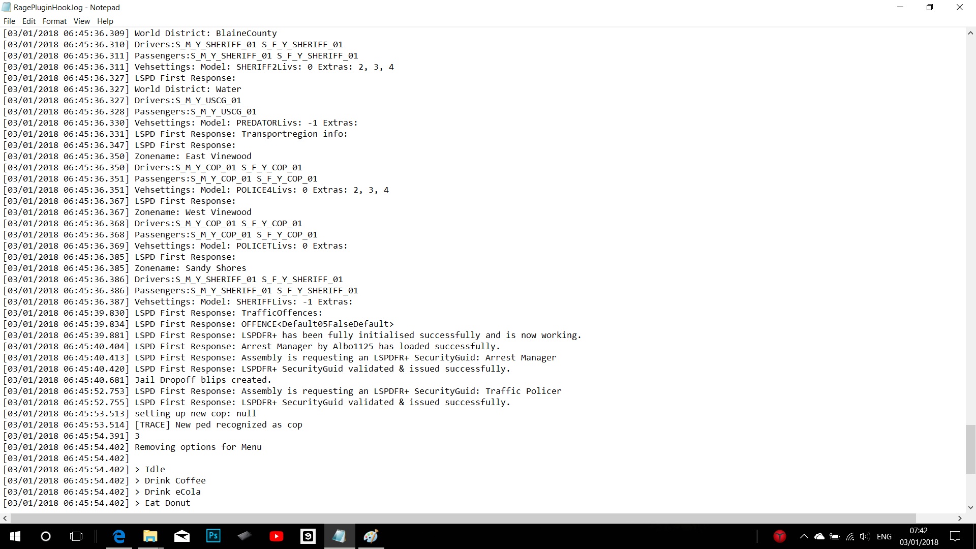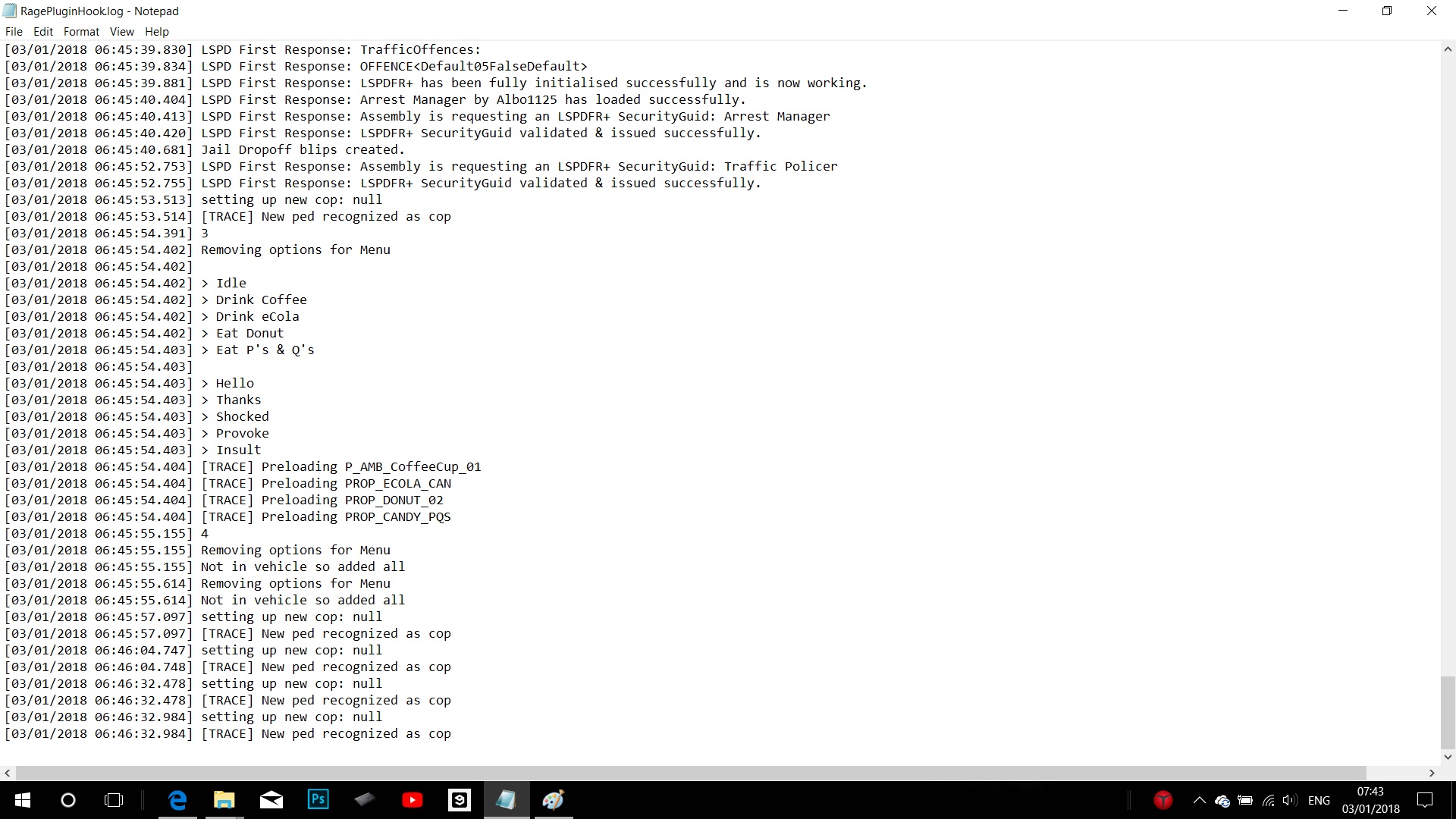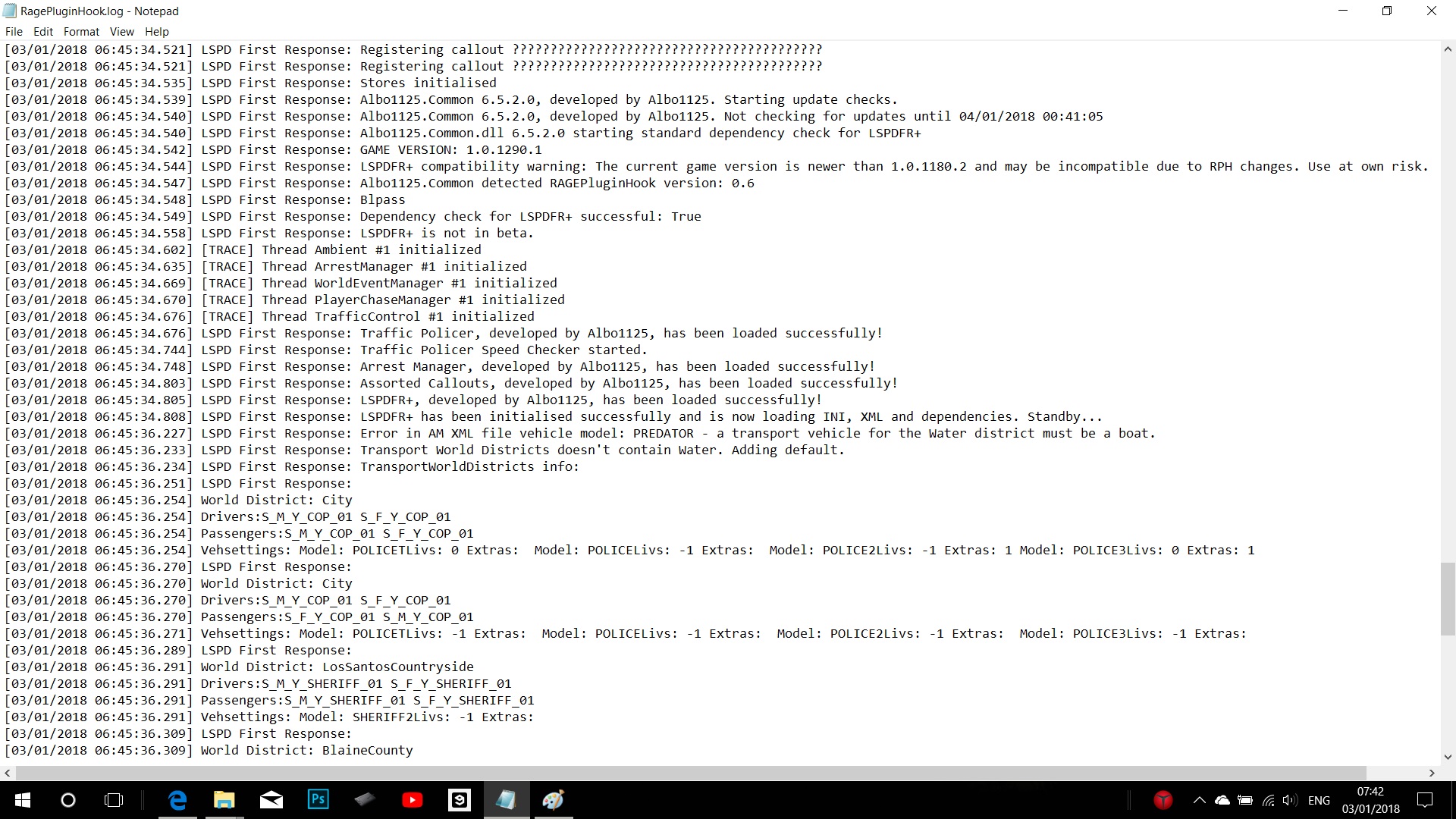 [03/01/2018 08:19:22.734] Started new log on 03/01/2018 08:19:22.734 [03/01/2018 08:19:22.737] ==================================================================================================== [03/01/2018 08:19:22.728] Log path: C:\Program Files (x86)\Steam\steamapps\common\Grand Theft Auto V\RagePluginHook.log [03/01/2018 08:19:22.738] Log verbosity: Trivial [03/01/2018 08:19:22.740] Initializing input system [03/01/2018 08:19:22.743] Initializing game console [03/01/2018 08:19:22.751] Console key has been set to F4 (key code: 115) [03/01/2018 08:19:22.848] Initializing console variable "ConsoleScrollAmount". [03/01/2018 08:19:22.849] Type: System.Int32, Reading section: "Miscellaneous", key: ConsoleScrollAmount [03/01/2018 08:19:22.852] Read value: <null> [03/01/2018 08:19:22.852] Initializing console variable "DisableRenderVersionText". [03/01/2018 08:19:22.852] Type: System.Boolean, Reading section: "Miscellaneous", key: DisableRenderVersionText [03/01/2018 08:19:22.859] Read value: True [03/01/2018 08:19:22.859] Setting value of console variable "DisableRenderVersionText" to stored value. [03/01/2018 08:19:22.859] Initializing console variable "ConsoleKey". [03/01/2018 08:19:22.859] Type: System.Windows.Forms.Keys, Reading section: "Miscellaneous", key: ConsoleKey [03/01/2018 08:19:22.860] Read value: <null> [03/01/2018 08:19:22.860] Initializing console variable "PluginTimeoutThreshold". [03/01/2018 08:19:22.860] Type: System.Int32, Reading section: "Miscellaneous", key: PluginTimeoutThreshold [03/01/2018 08:19:22.861] Read value: 10000 [03/01/2018 08:19:22.861] Setting value of console variable "PluginTimeoutThreshold" to stored value. [03/01/2018 08:19:22.862] Initializing console variable "AlwaysShowConsoleOutput". [03/01/2018 08:19:22.862] Type: System.Boolean, Reading section: "Miscellaneous", key: AlwaysShowConsoleOutput [03/01/2018 08:19:22.862] Read value: <null> [03/01/2018 08:19:22.862] Initializing console variable "ShowConsoleCommandInfoOnPluginLoad". [03/01/2018 08:19:22.862] Type: System.Boolean, Reading section: "Miscellaneous", key: ShowConsoleCommandInfoOnPluginLoad [03/01/2018 08:19:22.863] Read value: <null> [03/01/2018 08:19:22.863] Initializing console variable "ShowOnScreenWarnings". [03/01/2018 08:19:22.863] Type: System.Boolean, Reading section: "Miscellaneous", key: ShowOnScreenWarnings [03/01/2018 08:19:22.864] Read value: <null> [03/01/2018 08:19:22.865] Console initialized [03/01/2018 08:19:22.865] Initializing forms manager [03/01/2018 08:19:22.868] Version: RAGE Plugin Hook v0.60.1201.14419 PUBLIC ALPHA for Grand Theft Auto V [03/01/2018 08:19:22.876] ================ RAGE Plugin Hook ================ [03/01/2018 08:19:22.890] Detected Windows 10 Home (64-bit) (10.0.16299.0)! [03/01/2018 08:19:22.897] Checking game support [03/01/2018 08:19:23.173] Product name: Grand Theft Auto V [03/01/2018 08:19:23.175] Product version: 1.0.1290.1 [03/01/2018 08:19:23.176] Is steam version: True [03/01/2018 08:19:23.178] Initializing DirectX [03/01/2018 08:19:23.180] Initializing Direct3D [03/01/2018 08:19:23.181] Loading C:\WINDOWS\system32\d3d11.dll [03/01/2018 08:19:23.182] Loaded at 0x7FFC473D0000 [03/01/2018 08:19:23.182] D3D11CreateDeviceAndSwapChain at 0x7FFC47423030 [03/01/2018 08:19:23.183] Creating Direct3D 11 device and swap chain [03/01/2018 08:19:23.233] Swap Chain created: 0x22185EB15C0 [03/01/2018 08:19:23.236] Swap Chain VTable: 0x22185EB15C0 [03/01/2018 08:19:23.237] Swap Chain VTable_2: 0x7FFC48F88018 [03/01/2018 08:19:23.237] 0x748948000AE3E5E9;0x8D48564157552024;0x170EC814890246C [03/01/2018 08:19:23.238] D3D11Present: 0x7FFC48F21D20 [03/01/2018 08:19:23.238] D3D11ResizeBuffers: 0x7FFC48F30290 [03/01/2018 08:19:23.238] D3D11ResizeTarget: 0x7FFC48F80480 [03/01/2018 08:19:23.239] D3D11SetFullscreenState: 0x7FFC48F3DAF0 [03/01/2018 08:19:23.239] Getting device [03/01/2018 08:19:23.240] Retrieved device [03/01/2018 08:19:23.240] Creating wrapper [03/01/2018 08:19:23.259] Direct3D initialized [03/01/2018 08:19:23.260] Initialized DirectX [03/01/2018 08:19:23.261] Direct3D watcher thread spawned [03/01/2018 08:19:23.311] Wrapper created [03/01/2018 08:19:23.318] Effect created [03/01/2018 08:19:23.318] Creating buffer [03/01/2018 08:19:23.318] Created buffer [03/01/2018 08:19:23.319] Creating blend state [03/01/2018 08:19:23.319] Created blend state [03/01/2018 08:19:23.319] Done with creation [03/01/2018 08:19:23.368] Initializing texture system. [03/01/2018 08:19:23.369] Initializing texture system; phase 1 [03/01/2018 08:19:23.370] Initializing texture system; phase 2 [03/01/2018 08:19:23.376] Initializing texture system; phase 3 [03/01/2018 08:19:23.377] Initializing texture system; phase 4 [03/01/2018 08:19:23.387] Initializing texture system; phase 5 [03/01/2018 08:19:23.389] Initializing texture system; phase 6 [03/01/2018 08:19:23.391] Initializing texture system; phase 7 [03/01/2018 08:19:23.393] Initializing texture system; phase 8 [03/01/2018 08:19:23.394] Initializing texture system; phase 9 [03/01/2018 08:19:23.396] Initializing texture system; phase 10 [03/01/2018 08:19:23.400] Initializing texture system; phase 11 [03/01/2018 08:19:23.400] Initializing texture system; phase 12 [03/01/2018 08:19:23.402] Initializing texture system; phase 13 [03/01/2018 08:19:23.402] Initializing texture system; phase 14 [03/01/2018 08:19:28.262] Direct3D watcher thread ended [03/01/2018 08:19:53.837] LoadingScreenMsg: Initializing game support [03/01/2018 08:19:54.089] Initializing game support [03/01/2018 08:19:54.788] LoadingScreenMsg: Velocity limit removed [03/01/2018 08:19:55.116] Compatibility level: 0 [03/01/2018 08:19:55.118] Supported version detected [03/01/2018 08:19:55.118] ================================================== [03/01/2018 08:19:55.119] LoadingScreenMsg: Patching code [03/01/2018 08:19:55.370] LoadingScreenMsg: Waiting for game initialization [03/01/2018 08:19:55.623] Waiting for game initialization [03/01/2018 08:19:55.726] Lo