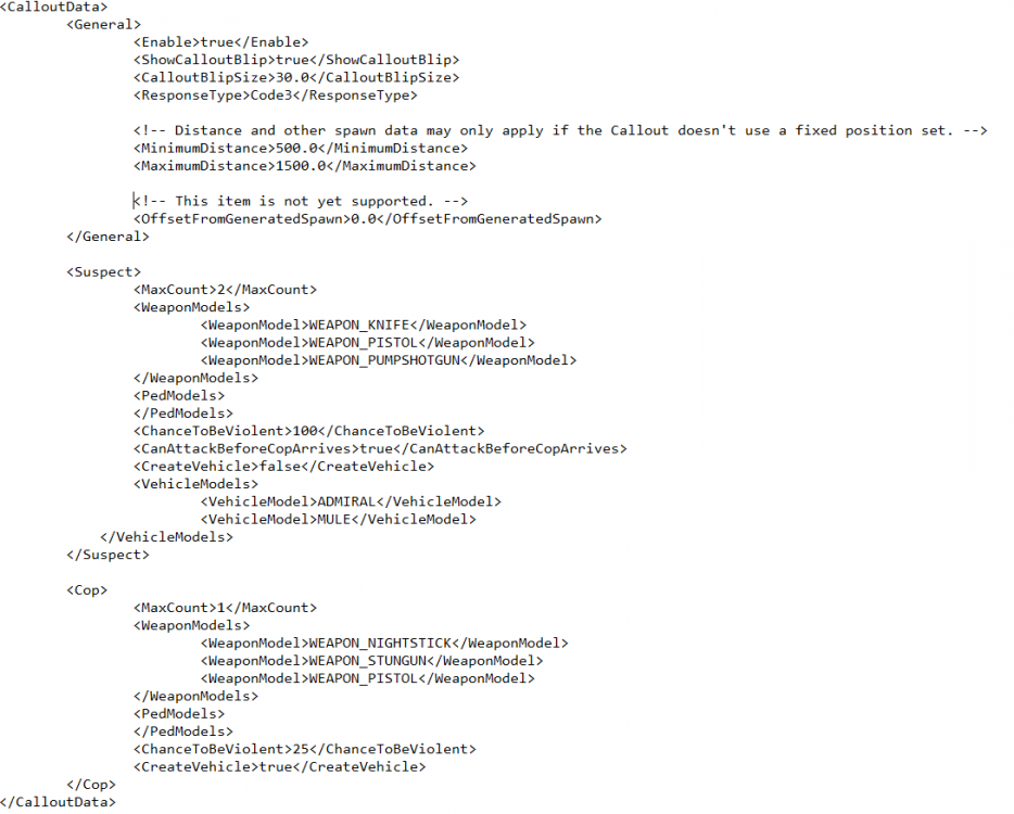 Update 1/19: I'm not happy with the current infrastructure being used for the plugin and have recently begun rebuilding from scratch in order to develop a better core that can better support what I want out of this project (as well as help ensure more compatibility with LSPDFR 0.4 once released). Some of the progress being made: More versatile dependency checking and internal layout, allowing for better integrations of other scripts and plugins Completed interfaces for: Peds Callouts Base is done: integrated with ComputerPlus+ More versatility is being given to individual callout scripts compared to the previous iteration, especially during creation Added a basic validation system for beta/developer versions Added a system for checking for script updates Added a basic logging system Added a settings file with relevant loading system Update 1/22: I've managed to get a good amount of work done in my spare time, and have gotten to a point where I believe I have a good basis to begin implementing callouts. The first callout I'll be working on is a law agency distress call, and I will hopefully be able to use this callout to test the infrastructure I've created thus far. I'd like to extend an indirect thanks to Stealth22, as I've taken some inspiration from his Code 3 Callouts code base when it comes to certain parts of my own code base. Update 1/28: I've spent some of today tackling a lot of the issues I've been facing so far, and have gotten things mostly stable now. Update 1/30: I've gotten a lot of progress done as of recent and am close to having an initial Law Enforcement In Distress callout mostly functional. This is complete with basic callout configuration, including weapon types and amount of suspects. Doing this initial callout allows for me to develop systems such as callout data without having to apply it to multiple in development callouts all over the place. Once I've got this callout and general features of the plugin working solid, more will be worked on. Update 1/31: I've gotten a lot more work done today, especially with callout data and configuration. Some changes are still being made, but you can expect this level of configuration per Callout at least (.xml): There are also similar sets for other types of peds: Civilian, Security, Medic, Firefighter. I was originally going to handle this on a per callout basis, but have spent today redoing callout data so the same basic ped and general data is loaded in the callout handling script rather than the individual callout script. This ties back with feature #2 and #4: doing it this way keeps things more organized and reduces the amount of hack like code all over the place. I'm still not sure how I'm going to approach spawning Police Officers as I don't want to hack around the backup functions and the LSPDFR API doesn't provide direct access to this data. I could read the backup.xml file directly but I don't think that's a task I want to undertake as of now, especially with major changes coming to the backup system in 0.4. I might just hardcode based on county (an .xml might be done for that, a lot more basic than the regular backup.xml with just ped and vehicle model data strictly) for the 0.3.1 release and see what is natively offered in 0.4. I'll maybe look into adding Custom Backup Locations or Ultimate Backup as an additional (optional) script dependency to provide more control over spawning for this release. I believe at least Custom Backup Locations API provides data access that is viable for this. The work done today has been productive and has brought me a lot closer to being able to begin developing more of the callouts I want to try to push for the first release. I'm hoping to be able to have this ready before March provided development time allows. More to come soon. Stay tuned.