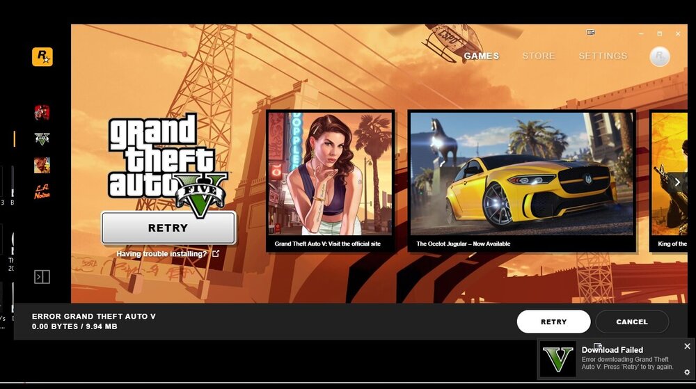 All of the sudden, on Friday or Saturday this past weekend, I went to open rage and the launcher started as usual, but it kept wanting to download a 9.94mb update or file for GTAV. Every time it tries to start downloading it, it immediately fails with zero progress. You can click Retry, which yields the same result, or just quit. I tried to get in with a launcher bypass, which works fine to play normal single player mode, but Rage will not hook into it. I've tried all the possible times when to start Rage, and every time I get the slow systems error. I cant find anywhere on Rockstar's site or any site for that matter with this problem.