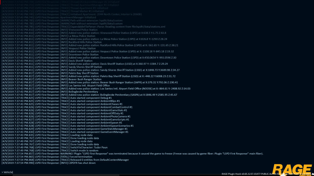 Whenever I open up rage plugin it loads normally until i get the black screen with the spinning circle on the bottom right. LSPDFR would then crash on the screen or completely crash the whole game. I restarted my pc many times. Turned my anti-virus off. Replaced LSPDFR.dll. Ran as administrator. I did all i can. Although this happens it 99% of the time, very rarely on the 1% it loads up perfectly with all the mods and scripts working just fine with no bugs or crashes. Normal GTA 5 loads up normally. I know it is something to do with the LSPDFR.dll 4.0 (newest version). I also sometimes get an error labelled 'Blocked plugin caused GTA 5 to crash'.