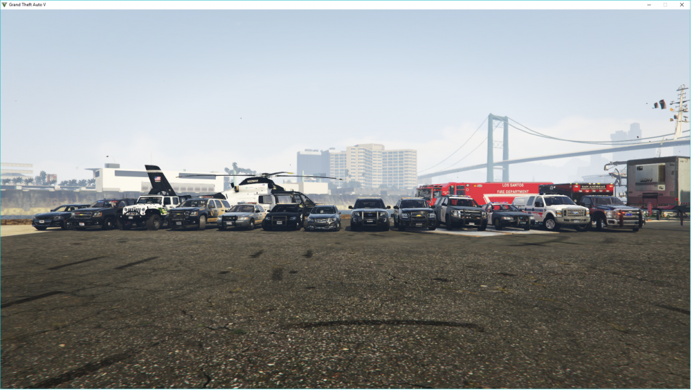 this is lspdfr and just using all available slots, from left i have fbi1/2, pranger, sheriff1/2, police1-4, policeold1/2, lguard, ambulance and obvously the firetruck and chopper