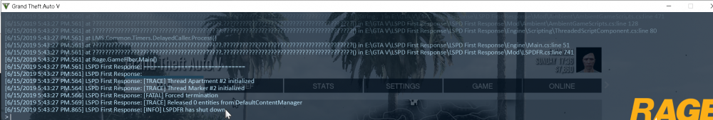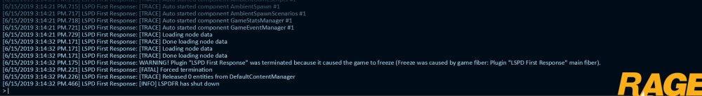 Hello all, I started up today using new Rage Hook Plugin and LSPDFR at the latest version, I came across some errors. Whenever I start loading up the LSPDFR rage hook plugin stops it because "it caused the game to freeze" after that it said the reason had something to do with "fiber", "main" to be the cause of the crash. Any idea to solve this?