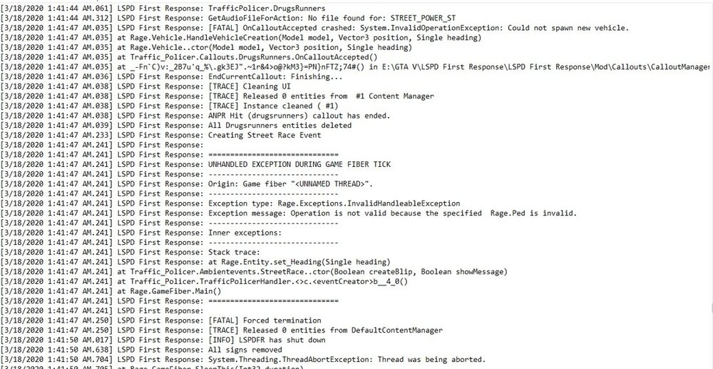 7. Hi there! I've recently started modding GTA V and for right now, this issue has been always cropping up. LSPDFR Crashes every 10-20 mins or so, whenever I go on duty there's a chance that it'll crash. RagePluginHook.log And accepting call outs too specifically this as mentioned in the provided image