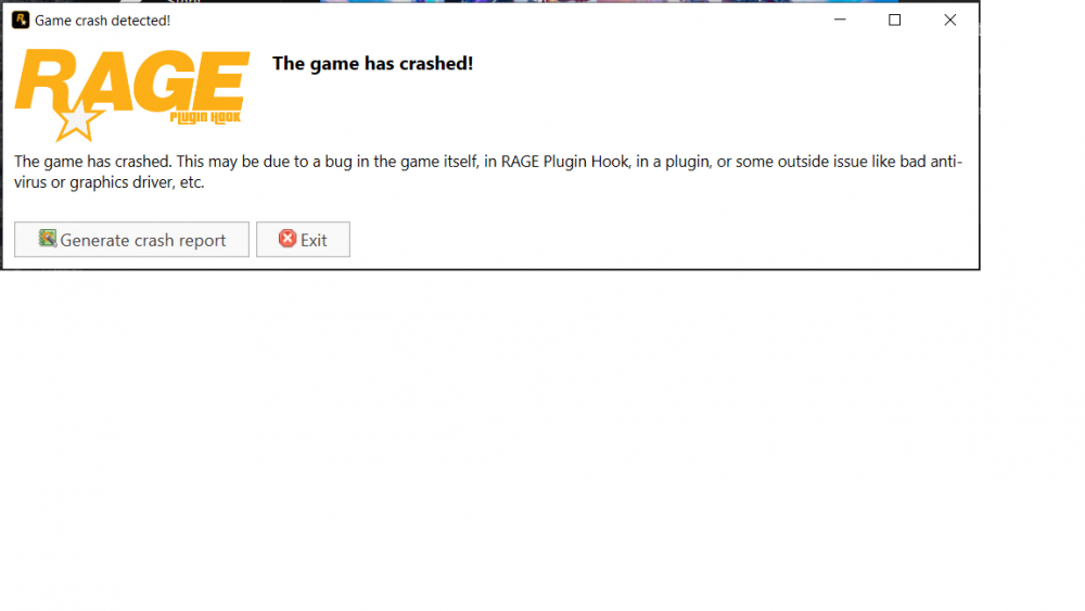 I launch my GTA V with rage plugin hook and it just crashes my game, i tried everything on the internet like reinstalling social club launcher, turned off anti-virus, updated my driver, reinstalling rage plugin hook,etc. and noting work.When i run gta v without rage plugin hook, my gta v will stopped working and crashes also. I run perfectly fine with rage plugin hook until today i install visualV and restore it , after restore back to normal graphic my game will just crashes , it really pissed me off. Does anyone have any working solution to help me solve this.