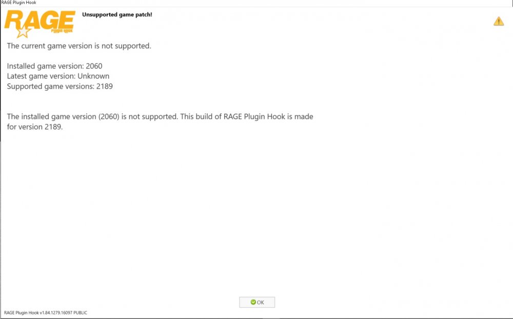 Hello everyone, I have updated GTA V to the latest update, including RPH, scripthookV and LSPD:FR. My problem now is that when launch Ragepluginhook, it says that my intalled game version is 2060 and the RPH says its for 2189, which I have installed. (I use the Epic Games Store) As you can see in the attachments, My game version is up to date (Ver. 2189) and so is my RPH (Ver. 1.84) and it says I have the earlier version of GTA V, and won't let me play with RPH. Does anyone have a solution?