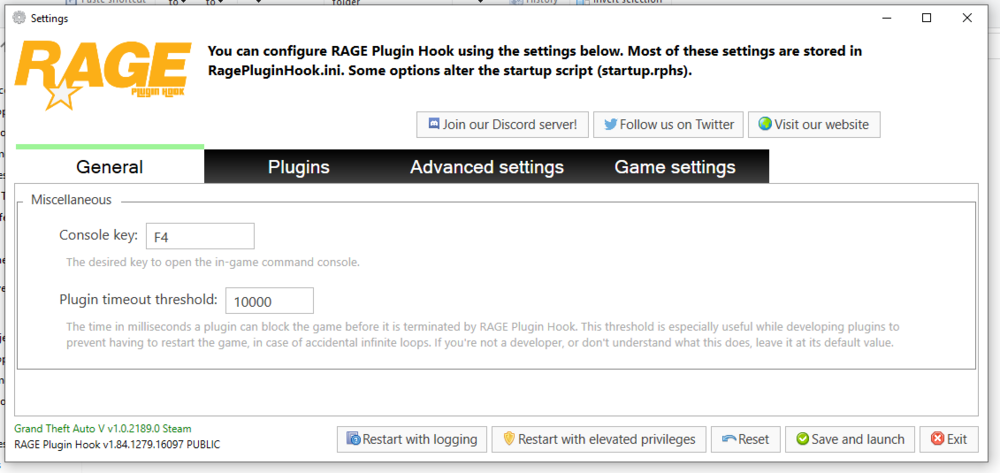 1. Sorry guys. Got caught in the middle of another issue. So, launch it through Rage. The program does its thing, then I get the error message it never loads... Is the attached log the one you are looking for? thanks, RagePluginHook_01092020_204238.log