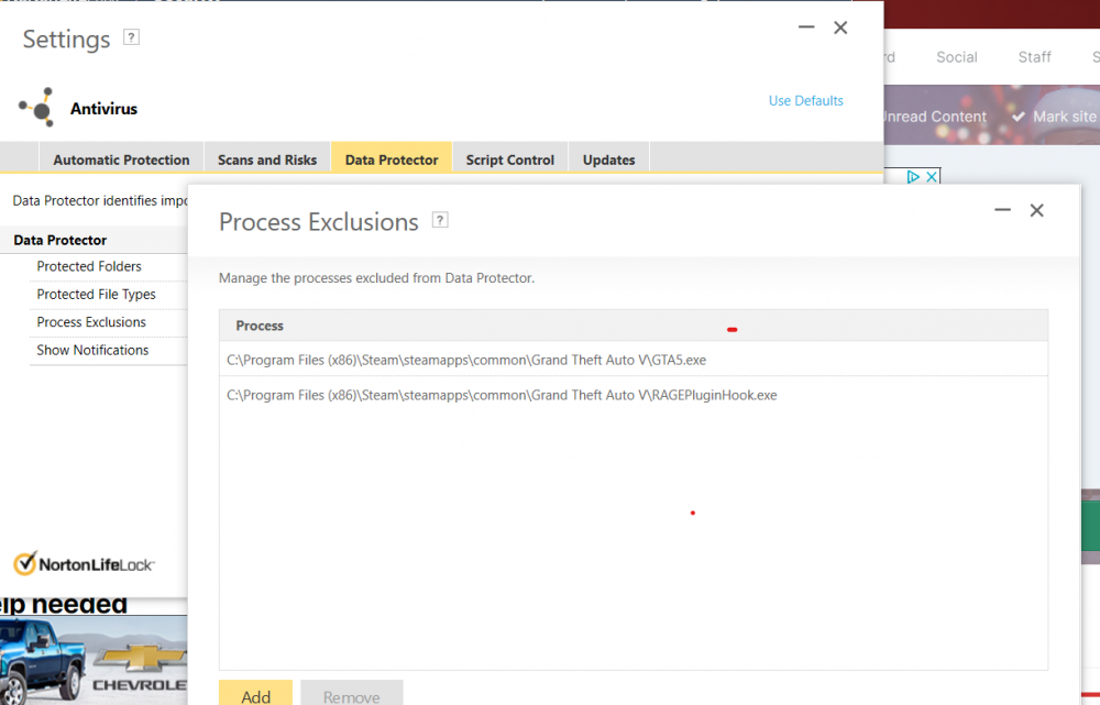 3. Ok so GTA5 was already in Defender, but I added Rage... Then I went into Norton and changed GTA5 from Auto to Allow and then added Rage plugin... Then I went to Antivirus>Data Protector>Process Exclusions and added GTA5 and Rage Plugin... This still give me the same error - the LSPD First Response.dll is not found... if you have any other ideas, please let me know! Thanks!