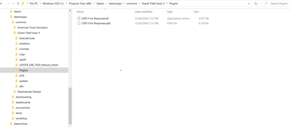 5. Hi there! New user here, so I apologize if this isn't the place to report this. I Installed latest LCPDFR and Rage plugin today to work with GTA5 on my Lenovo laptop. Followed the instructions as best as possible, and have everything as it says on the Verify Installation section of the Installation Page. Tried to load GTA5 with the Rage plugin and LCPDFR doesn't load. The end of the log file says: [12/26/2020 10:29:49 PM.900] Loading plugin from path: C:\Program Files (x86)\Steam\steamapps\common\Grand Theft Auto V\Plugins\LSPD First Response.dll [12/26/2020 10:29:52 PM.331] <UNLOADED PLUGIN>: Initializing input system [12/26/2020 10:29:52 PM.332] <UNLOADED PLUGIN>: Initializing game console [12/26/2020 10:29:52 PM.333] <UNLOADED PLUGIN>: Initializing forms manager [12/26/2020 10:29:52 PM.415] ERROR: Could not load plugin from "C:\Program Files (x86)\Steam\steamapps\common\Grand Theft Auto V\Plugins\LSPD First Response.dll". Could not load file or assembly 'LSPD First Response, Version=0.4.7659.32941, Culture=neutral, PublicKeyToken=null' or one of its dependencies. The system cannot find the file specified. The problem is that the file is clearly in the GTA5>Plugins folder. Has anyone encountered this issue before? Any ideas? I do have Norton360 running but it doesn't seem to interfere. Thanks in advance for the help!
