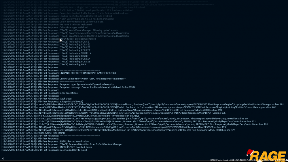 1. Quand je lance ragepluginhook tous va bien jusqu'au moment ou lspdfr charge et crash.... Je ne comprend pas pourquoi et merci a ce qui m'aidrons. Voici mes log