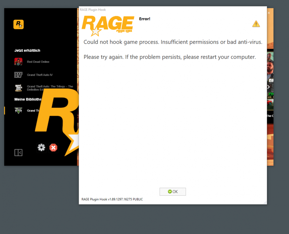 I have this issue with my Rage not hooking, I get an error saying "insufficient permission or bad anti-virus" I run Rage in admin mode and I have "Forced Windowed Mode" Ticked in game settings but the issue still persists. I also have Windows Defender which is the only anti-virus I have on my computer disabled for GTA 5.