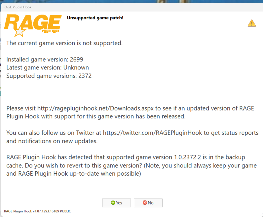 unfortunately, my game updated automatically because of steam! But I have a quick question I removed all the old plugins an scripts etc and then installed a new updated LCPDFR but now my game is just stuck on the loading screen. What am I doing wrong? I want to play LCPDFR but this is frustrating me! Any help would be appreciated Thank you in advance- Ragehook Unsupported patch Error