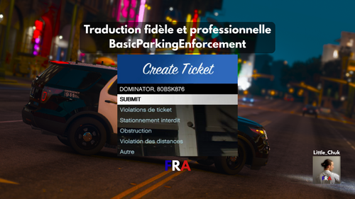 Bonjour! Cette traduction est basée sur Basic Parking Enforcement par Fobi (ThruZZd). Je suis en contact direct avec le développeur de ce plugin pour traduire tout le menu pas seulement les amendes alors restez à l'affut pour avoir une traduction complète ! D'autres traductions aussi fidèles que possible (car c'est mon métier) arrivent ! 😉 Installer dans Grand Theft Auto V>plugins>LSPDFR>BasicParkingEnforcement -