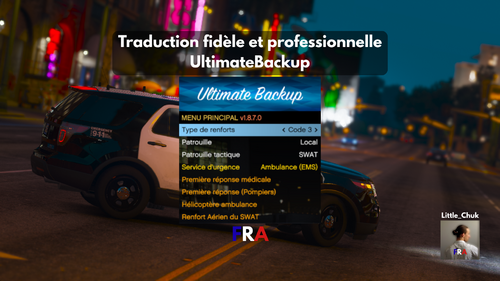 Bonjour ! Voici une nouvelle traduction qui m'a un peu de temps, basé sur le plugin UltimateBackup de BejoIjo. La prochaine traduction sera CompuLite ! Discord J'ai ouvert un discord que vous pourrez trouver en lien sur mon profil n'hésitez pas à le rejoindre pour voir les traductions avant qu'elle ne soit postées ! IMPORTANT L'utilisation de cette traduction est idéale et prévu pour un jeu en Américain, pas version Française. Mon discord est sur mon profil, si vous voulez me contacter pour des traductions de callouts, plugins et scripts, mes DM sont ouverts. Vous devez avoir installé au préalable le plugin original La traduction des peds en jeu dans le menu, section partenaire n'ont pas pu être et ne peuvent être traduite, elles correspondent à des codes dans le jeu de base donc impossible. Quoi de nouveau ? Vous me connaissez, comme d'habitude j'ai prêté attention aux textes qui se chevauchent ! Si vous trouvez des petits problèmes de traductions, envoyez-moi un message sur discord ou laissez un commentaire ! Je le rectifierai et enverrai une nouvelle version aussi vite que possible .rar : Vous trouverez les fichiers suivant dans le .rar : SpecialUnits.xml Localization.ini Installation : Glissez et déposez "plugins" dans la racine de GTA V -