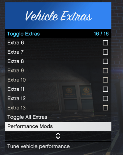 This plugin adds an in-game menu to toggle vehicle extras and performance modifications in Grand Theft Auto V. Perfect for customizing vehicles in real-time without needing a full trainer.